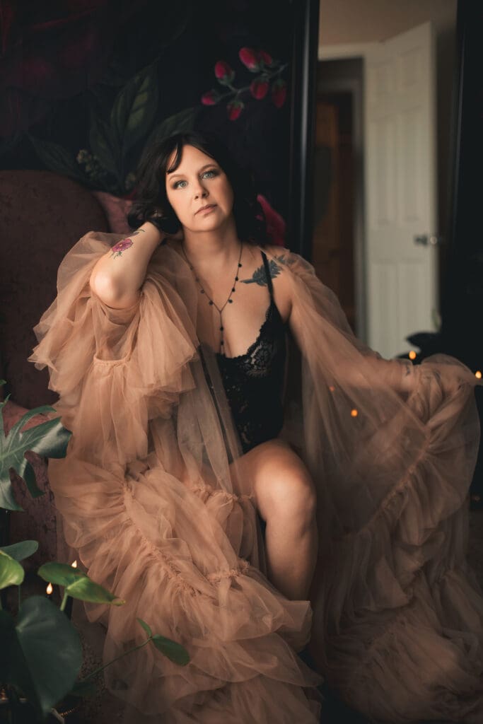 We went with quite a few of my favorite client closet looks. One of my favorite outfits is the black lace and velvet body suit she’s wearing with the big tulle robe (which is also available in the client closet!!). The only thing I didn’t have was her booky-sweater set. Everything else you see is available to pull for your own session!